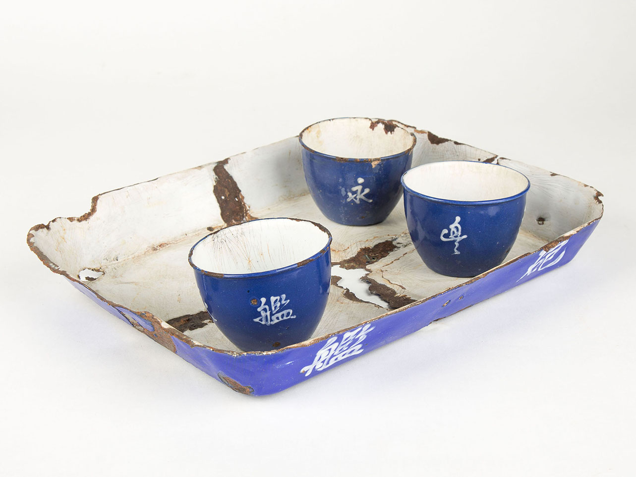 这套杯与盘原本为五件套(一盘四杯),现仅存一盘三杯。托盘为长方形,平底直斜四壁,盘内本应有“十字”交叉隔梁,但现仅存其痕迹,托盘外为蓝色,内为白色,外壁有“永丰”和“炮舰”四字楷书铭文。三只圆形无柄小杯为平底、弧腹、卷口沿、内外搪瓷色与托盘同,杯的外壁有“永丰炮舰”四字行书铭文。这是“永丰”时期留下的为数不多的文物之一。