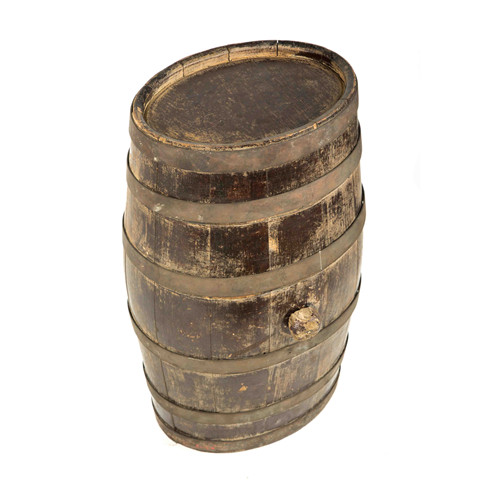 您眼前的这个乍一看很像啤酒桶的设备,其实是一只淡水桶。桶身上下两端小,中间粗,中部有一个堵着木塞的流水孔。整桶扎有六根扁形铁箍。根据中山舰幸存者陈鸣铮回忆,这是放置在救生艇上的淡水桶。